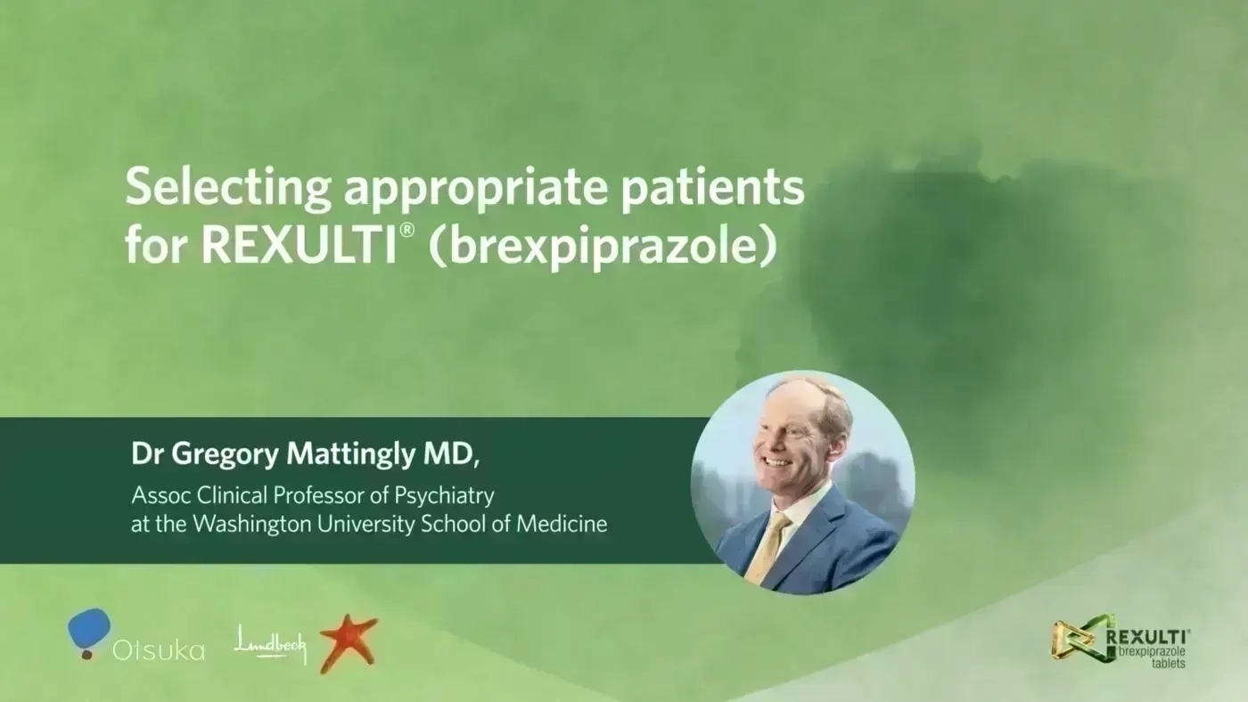 Watch Professor Gregory Mattingly as he describes which patients he’s seen benefit from REXULTI® and discusses his experience prescribing it for younger patients and patients early in the disease course.*